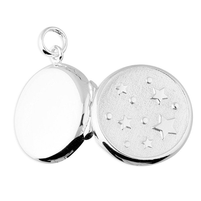 18mm round embossed polished stars sterling silver locket. Navya London includes a variety of designs from everlasting classic pieces to those with a modern day twist. Our 925 sterling silver allows for comfortable wear, especially for those with sensitive skin. Our silver products are created by applying traditional processes to contemporary designs inspiration from around the world, ensuring high quality craftsmanship and materials without losing the edge. A perfect gift for yourself or that special person in your life. Your jewel is presented in a beautiful gift box.