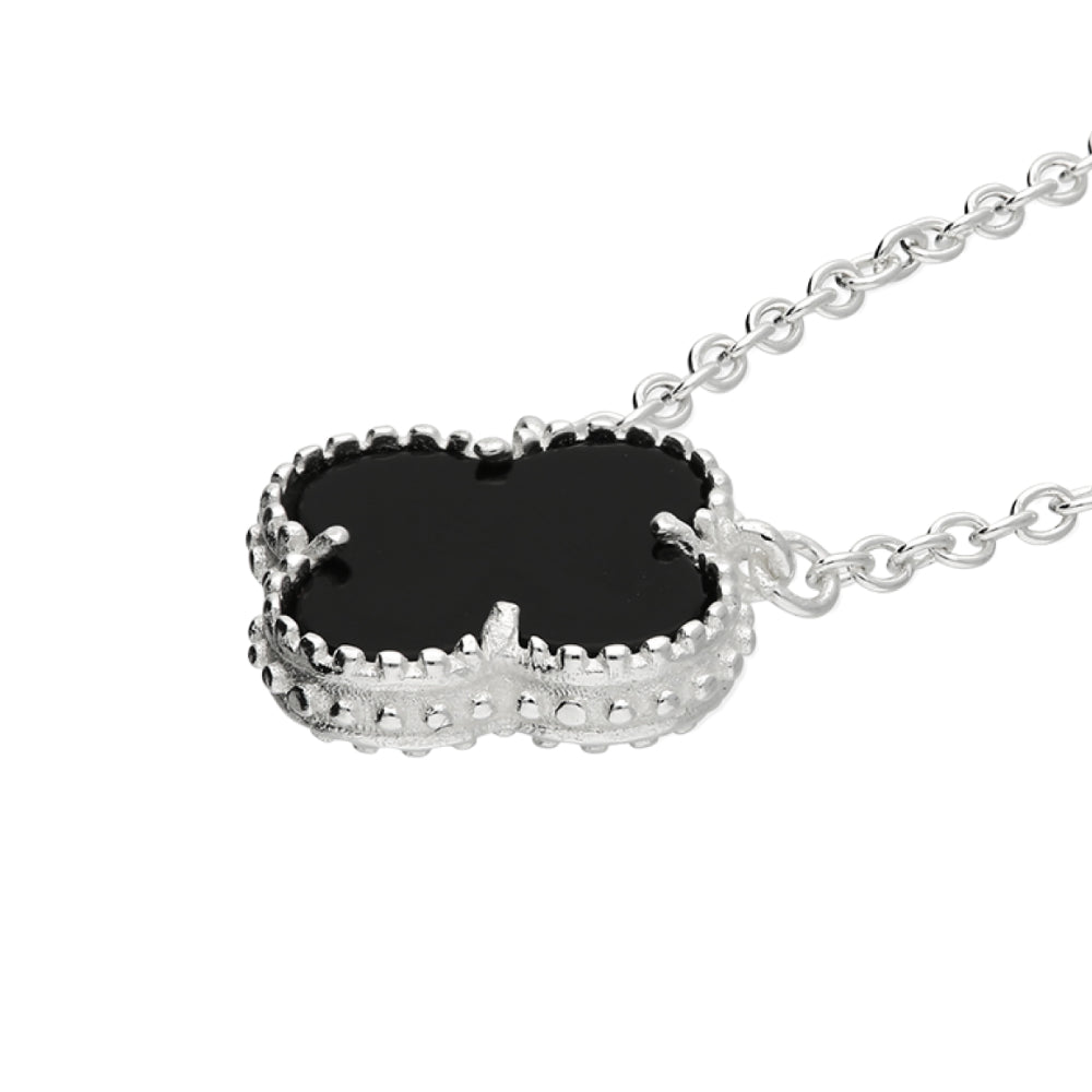 Classic synthetic onyx quatrefoil silver finish in 925 sterling silver necklace. Navya London includes a variety of designs from everlasting classic pieces to those with a modern day twist. Our 9ct, 925 sterling silver allows for comfortable wear, especially for those with sensitive skin. Our silver products are created by applying traditional processes to contemporary designs inspiration from around the world, ensuring high quality craftsmanship and materials without losing the edge. A perfect gift for yourself or that special person in your life. Your jewel is presented in a beautiful gift box.