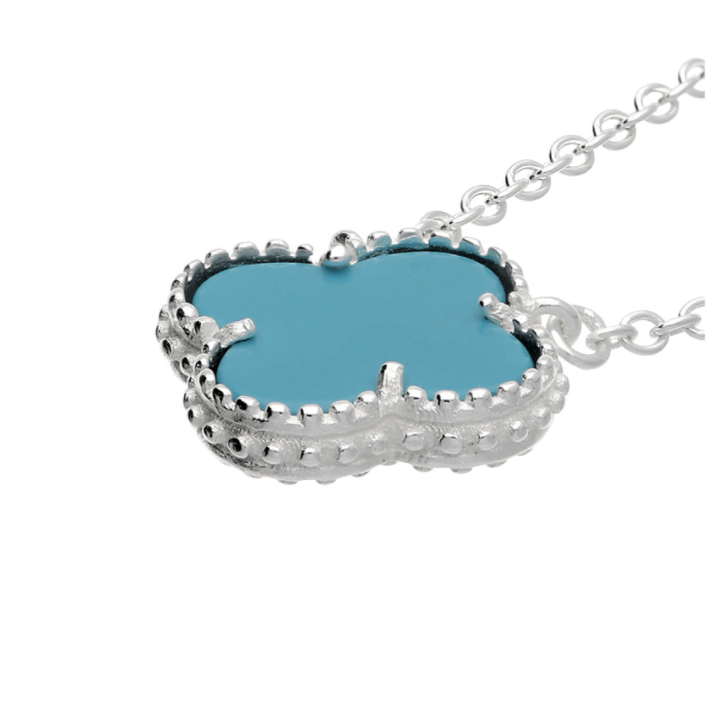 Classic synthetic turquoise quatrefoil silver finish in 925 sterling silver pendant. Navya London includes a variety of designs from everlasting classic pieces to those with a modern day twist. Our 9ct, 925 sterling silver allows for comfortable wear, especially for those with sensitive skin. Our silver products are created by applying traditional processes to contemporary designs inspiration from around the world, ensuring high quality craftsmanship and materials without losing the edge. A perfect gift for yourself or that special person in your life. Your jewel is presented in a beautiful gift box.