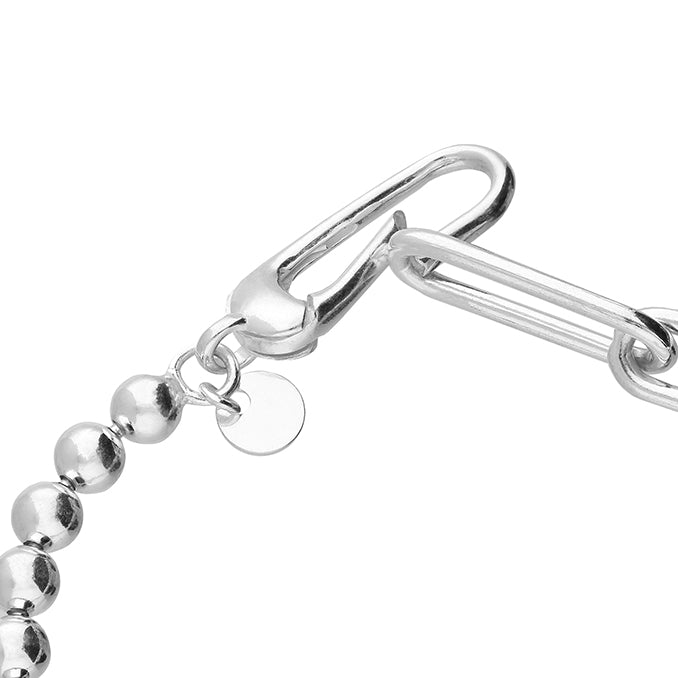 43cm long half bead and half paperlink in 925 sterling silver necklace. Navya London includes a variety of designs from everlasting classic pieces to those with a modern day twist. Our 925 sterling silver allows for comfortable wear, especially for those with sensitive skin. Our silver products are created by applying traditional processes to contemporary designs inspiration from around the world, ensuring high quality craftsmanship and materials without losing the edge. A perfect gift for yourself or that special person in your life. Your jewel is presented in a beautiful gift box.