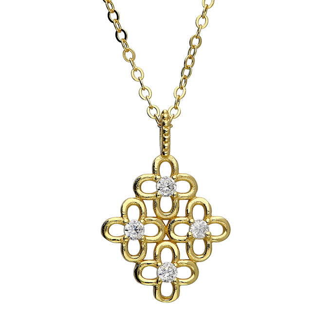 Multi quatrefoil design set with clear cubic zirconia stones for added sparkle. Elegantly suspended on a fine sterling silver yellow gold plated chain in 925 sterling silver necklace. Navya London isn’t just jewellery it’s a statement. From timeless classics to modern silhouettes with an edge, our pieces are designed for those who don’t follow trends they set them.