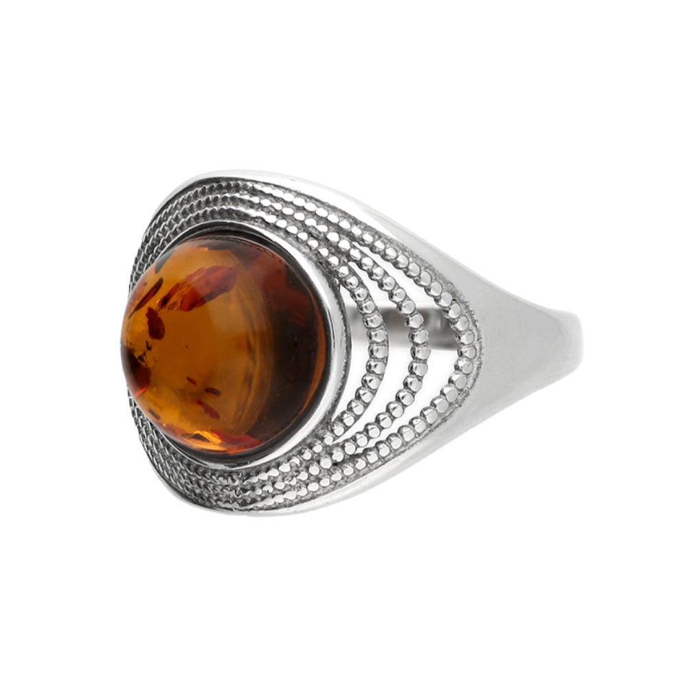 Baltic amber grand milligrain in 925 sterling silver ring. Navya London includes a variety of designs from everlasting classic pieces to those with a modern day twist. Our 925 sterling silver allows for comfortable wear, especially for those with sensitive skin. Our silver products are created by applying traditional processes to contemporary designs inspiration from around the world, ensuring high quality craftsmanship and materials without losing the edge. A perfect gift for yourself or that special person in your life. Your jewel is presented in a beautiful gift box.
