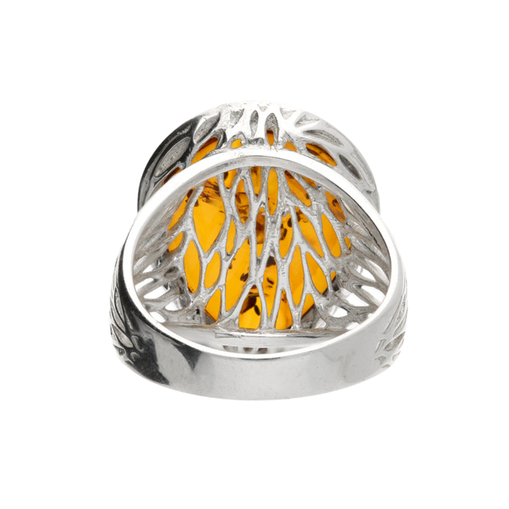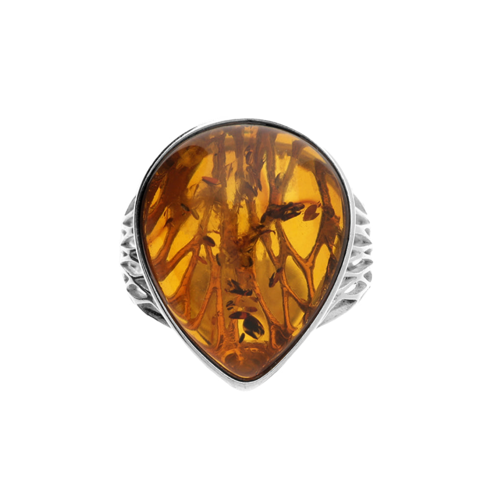 Cognac amber teardrop with open patterned shoulders in 925 sterling silver ring. Navya London includes a variety of designs from everlasting classic pieces to those with a modern day twist. Our 925 sterling silver allows for comfortable wear, especially for those with sensitive skin. Our silver products are created by applying traditional processes to contemporary designs inspiration from around the world, ensuring high quality craftsmanship and materials without losing the edge. A perfect gift for yourself or that special person in your life. Your jewel is presented in a beautiful gift box.