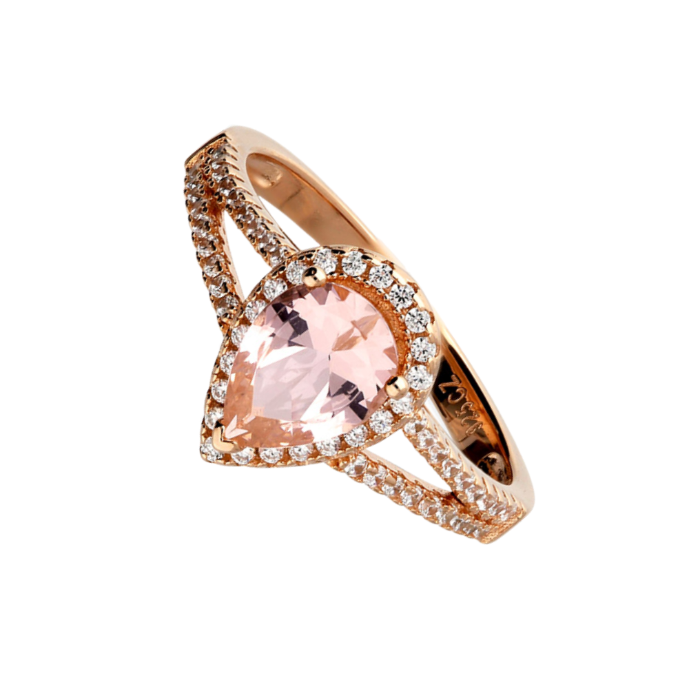 Teardrop morganite and cubic zirconia halo with split shoulder in 925 sterling silver ring. Navya London includes a variety of designs from everlasting classic pieces to those with a modern day twist. Our 9ct gold allows for comfortable wear, especially for those with sensitive skin. Our gold products are created by applying traditional processes to contemporary designs inspiration from around the world, ensuring high quality craftsmanship and materials without losing the edge. A perfect gift for yourself or that special person in your life. Your jewel is presented in a beautiful gift box.