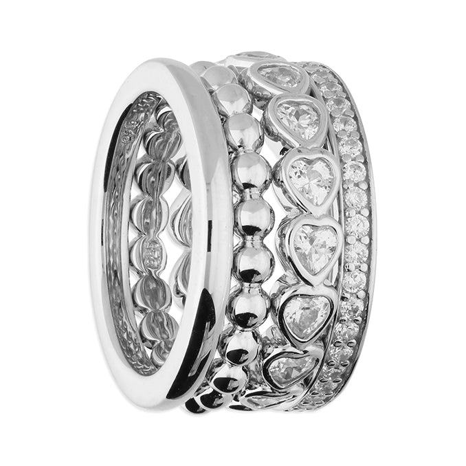 Set of four stacker two cubic zirconia eternities and two plain sterling silver rings. Navya London includes a variety of designs from everlasting classic pieces to those with a modern day twist. Our 925 sterling silver allows for comfortable wear, especially for those with sensitive skin. Our silver products are created by applying traditional processes to contemporary designs inspiration from around the world, ensuring high quality craftsmanship and materials without losing the edge. A perfect gift for yourself or that special person in your life. Your jewel is presented in a beautiful gift box.