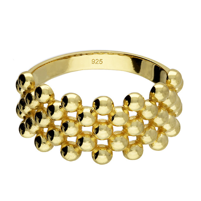 Yellow gold plated granulated wide band in 925 sterling silver ring. Navya London includes a variety of designs from everlasting classic pieces to those with a modern day twist. Our 925 sterling silver allows for comfortable wear, especially for those with sensitive skin. Our silver products are created by applying traditional processes to contemporary designs inspiration from around the world, ensuring high quality craftsmanship and materials without losing the edge. A perfect gift for yourself or that special person in your life. Your jewel is presented in a beautiful gift box.