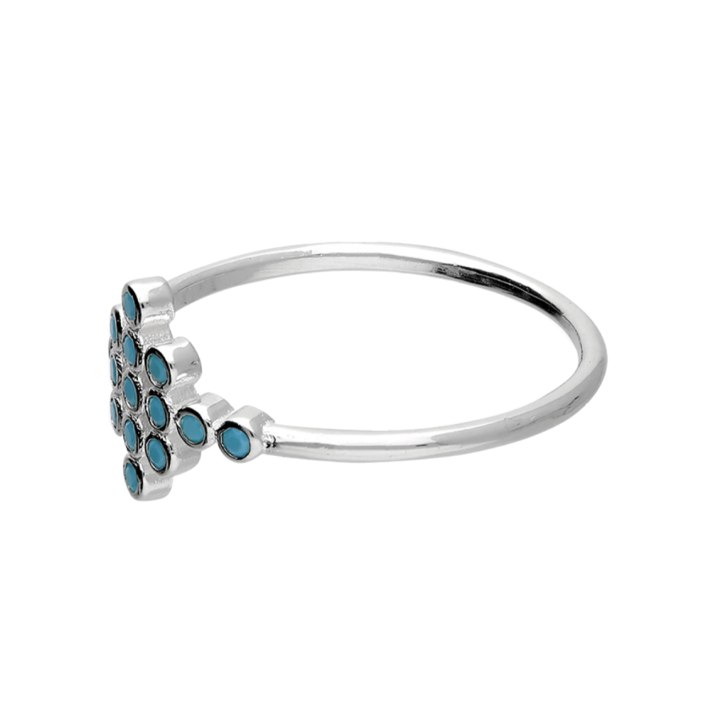Micro synthetic turquoise coloured stone in 925 sterling silver ring. Navya London includes a variety of designs from everlasting classic pieces to those with a modern day twist. Our 9ct gold allows for comfortable wear, especially for those with sensitive skin. Our gold products are created by applying traditional processes to contemporary designs inspiration from around the world, ensuring high quality craftsmanship and materials without losing the edge. A perfect gift for yourself or that special person in your life. Your jewel is presented in a beautiful gift box.