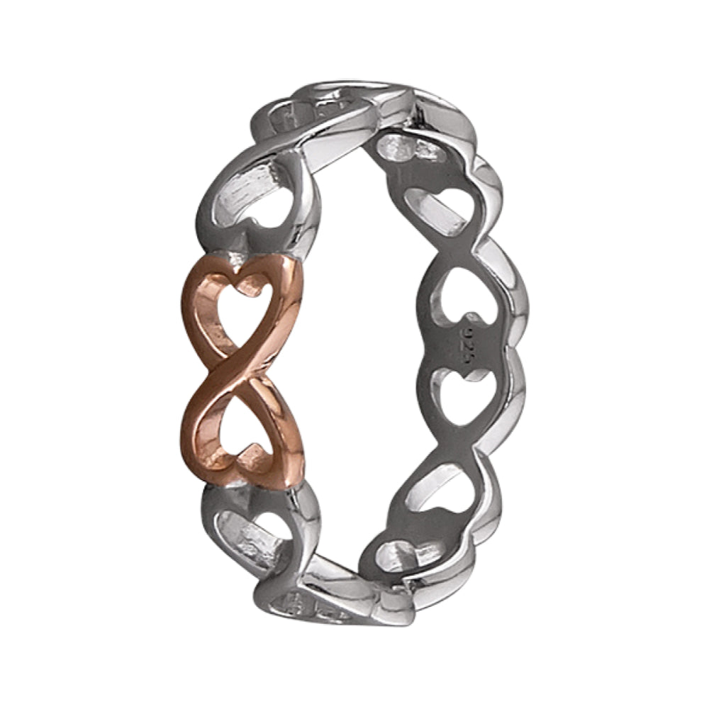 Two tone rose gold plated infinity heart band in 925 sterling silver ring. Navya London includes a variety of designs from everlasting classic pieces to those with a modern day twist. Our 9ct, 925 sterling silver allows for comfortable wear, especially for those with sensitive skin. Our silver products are created by applying traditional processes to contemporary designs inspiration from around the world, ensuring high quality craftsmanship and materials without losing the edge. A perfect gift for yourself or that special person in your life. Your jewel is presented in a beautiful gift box.