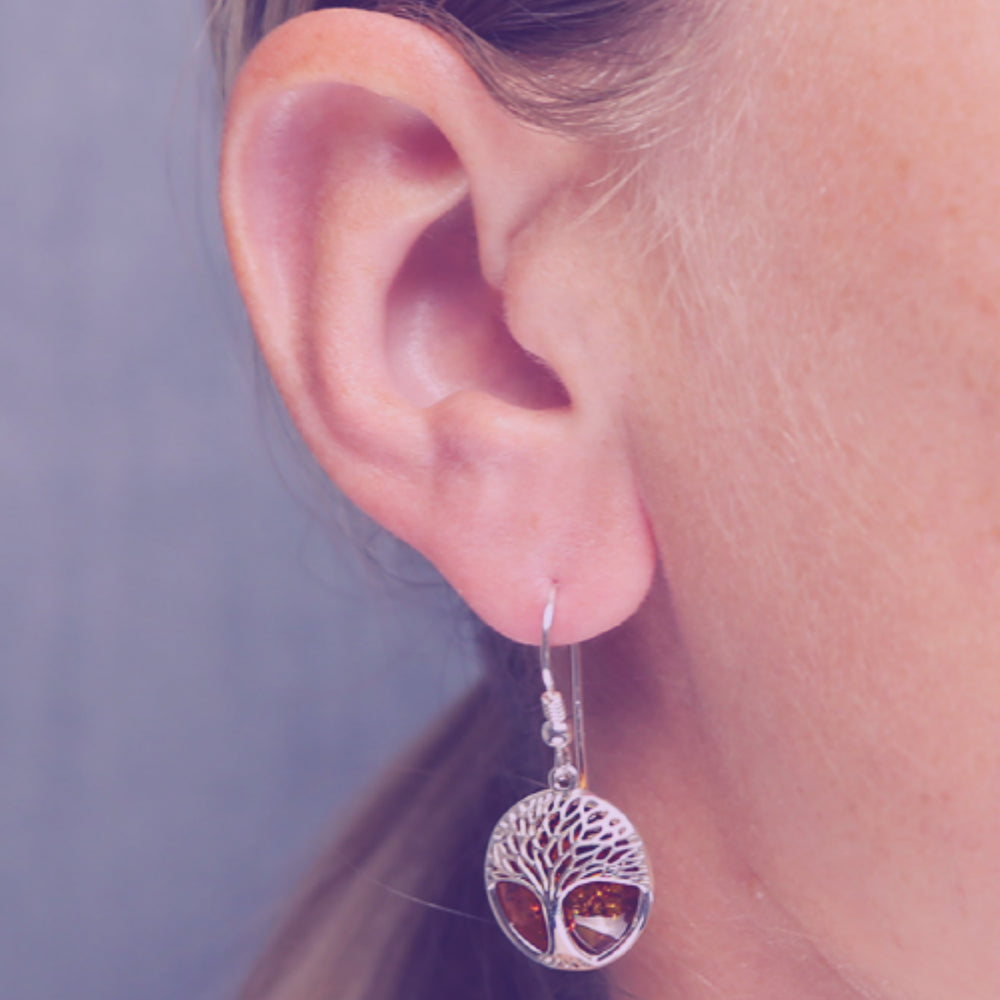 Cognac amber tree of life hook in drop in 925 sterling silver earrings. Navya London includes a variety of designs from everlasting classic pieces to those with a modern day twist. Our 925 sterling silver allows for comfortable wear, especially for those with sensitive skin. Our silver products are created by applying traditional processes to contemporary designs inspiration from around the world, ensuring high quality craftsmanship and materials without losing the edge. A perfect gift for yourself or that special person in your life. Your jewel is presented in a beautiful gift box.