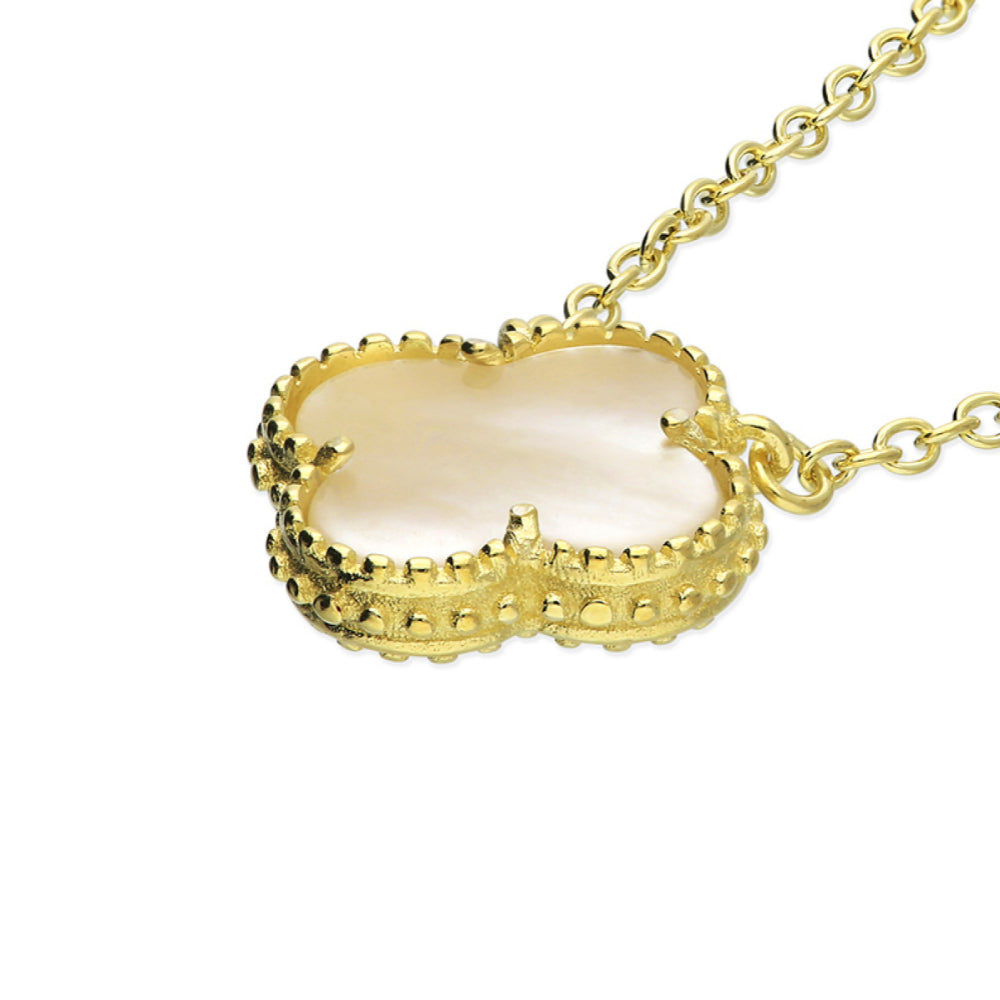 Classic mother of pearl quatrefoil yellow gold plated in 925 sterling silver necklace. Navya London includes a variety of designs from everlasting classic pieces to those with a modern day twist. Our 9ct, 925 sterling silver allows for comfortable wear, especially for those with sensitive skin. Our silver products are created by applying traditional processes to contemporary designs inspiration from around the world, ensuring high quality craftsmanship and materials without losing the edge. A perfect gift for yourself or that special person in your life. Your jewel is presented in a beautiful gift box.