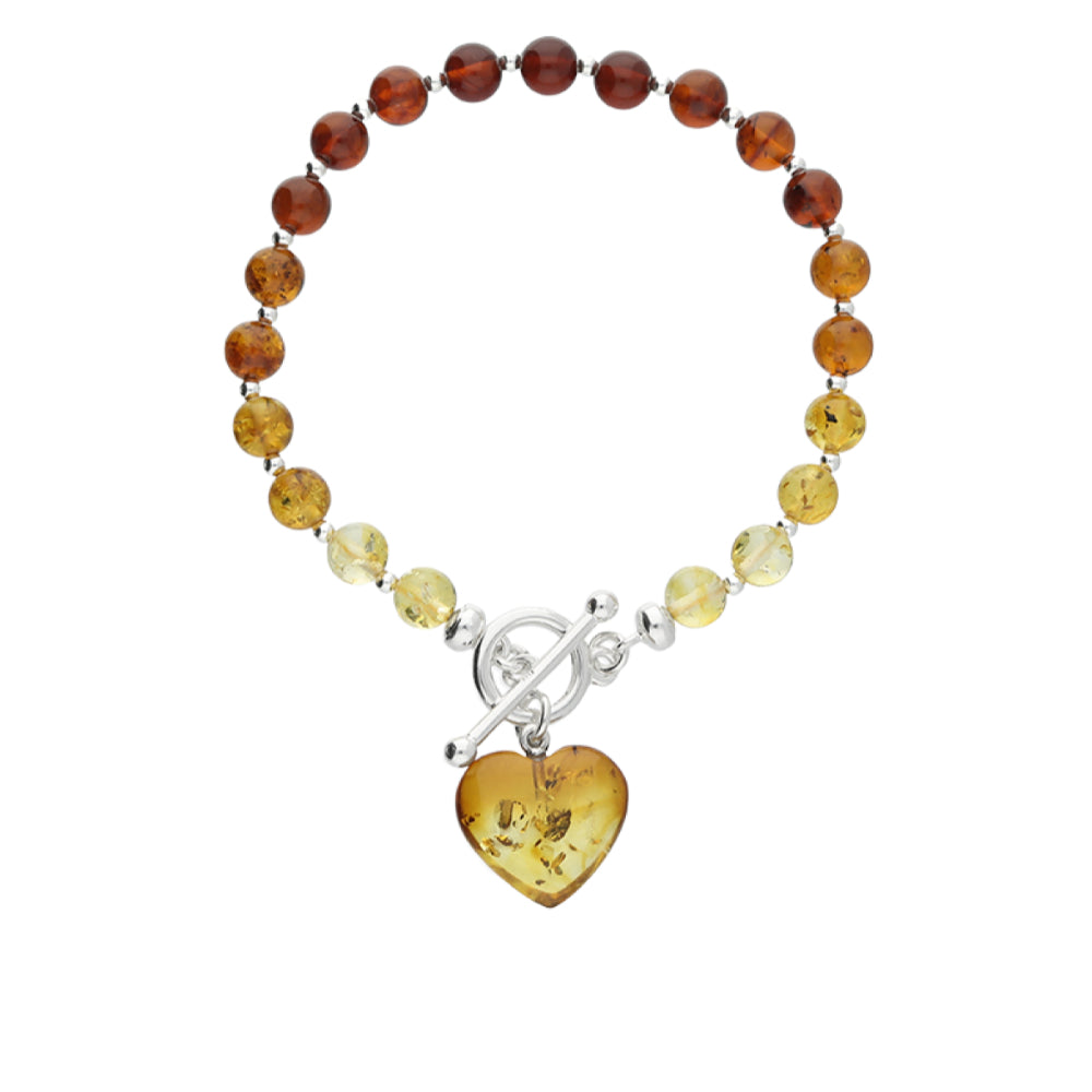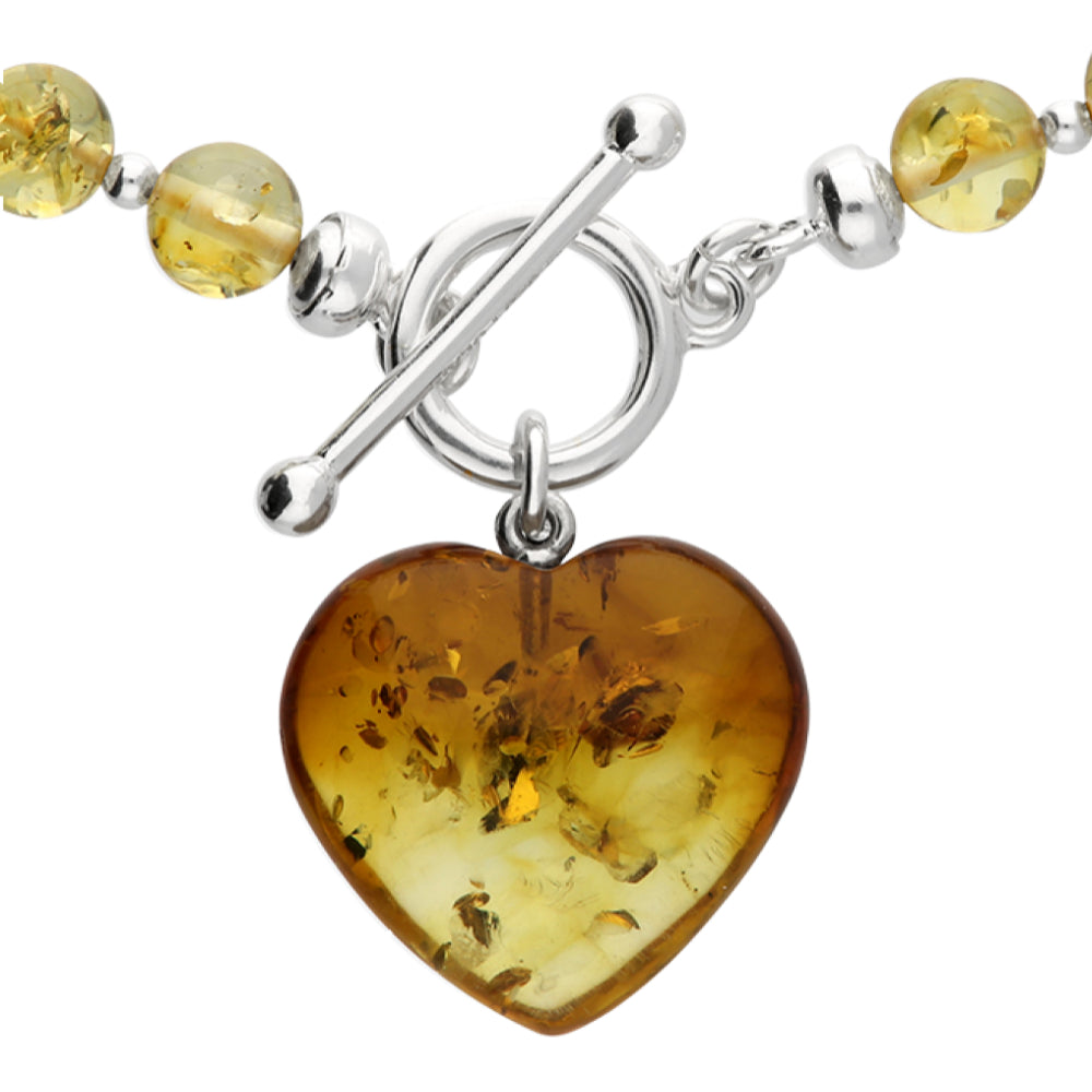 Cognac amber beads with a gradient of amber hues from a darker cognac to a lighter honey colour featuring a contemporary T-bar clasp and heart charm. The T-bar and heart add a modern aesthetic, which enhances the warm natural beauty of the amber in 925 sterling silver necklace.