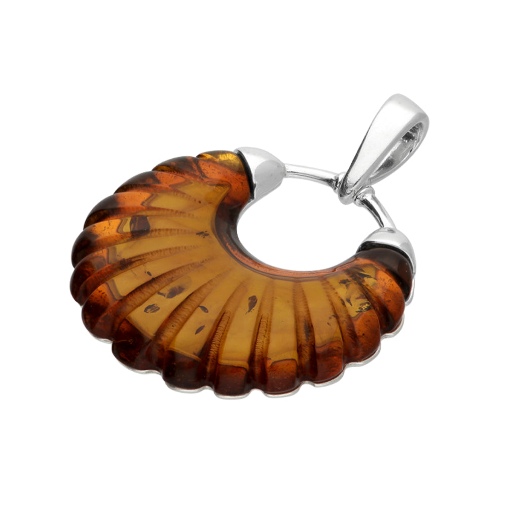 Cognac baltic amber with silver accents. The pendant has a fan like or shell like, scalloped shape, with a rich, deep amber hue that highlights natural inclusions within the amber, giving it a unique and organic appearance. Ideal for who appreciate natural gemstones with a modern twist in 925 sterling silver pendant.
