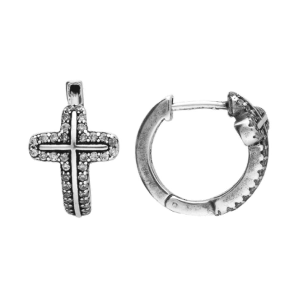 These cubic zirconia cross huggie earrings in oxidized silver plating showcase a blend of faith inspired symbolism and modern sophistication. Featuring intricately detailed cross charms adorned with fine texturing and subtle oxidized accents, they deliver a vintage inspired yet contemporary aesthetic in 925 sterling silver earrings.