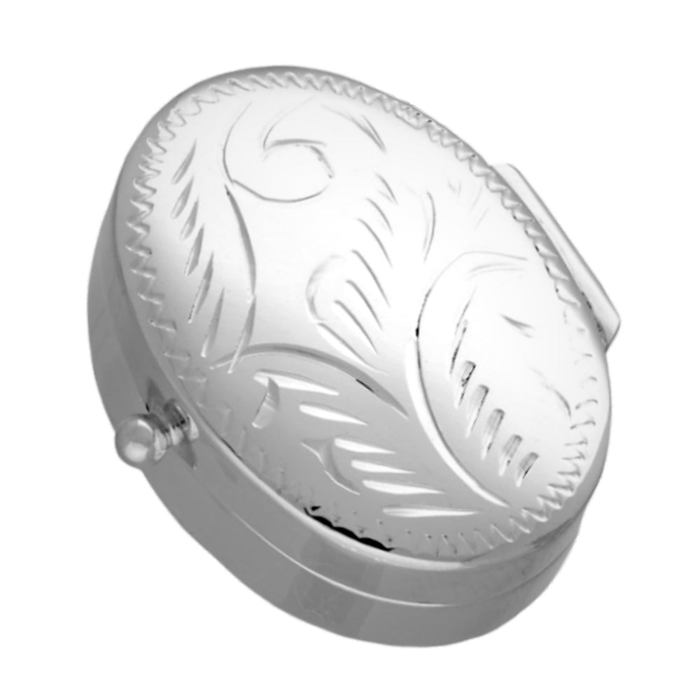 Small engraved oval pill box in 925 sterling silver. Navya London includes a variety of designs from everlasting classic pieces to those with a modern day twist. Our 925 sterling silver allows for comfortable wear, especially for those with sensitive skin. Our silver products are created by applying traditional processes to contemporary designs inspiration from around the world, ensuring high quality craftsmanship and materials without losing the edge. A perfect gift for yourself or that special person in your life. Your jewel is presented in a beautiful gift box.