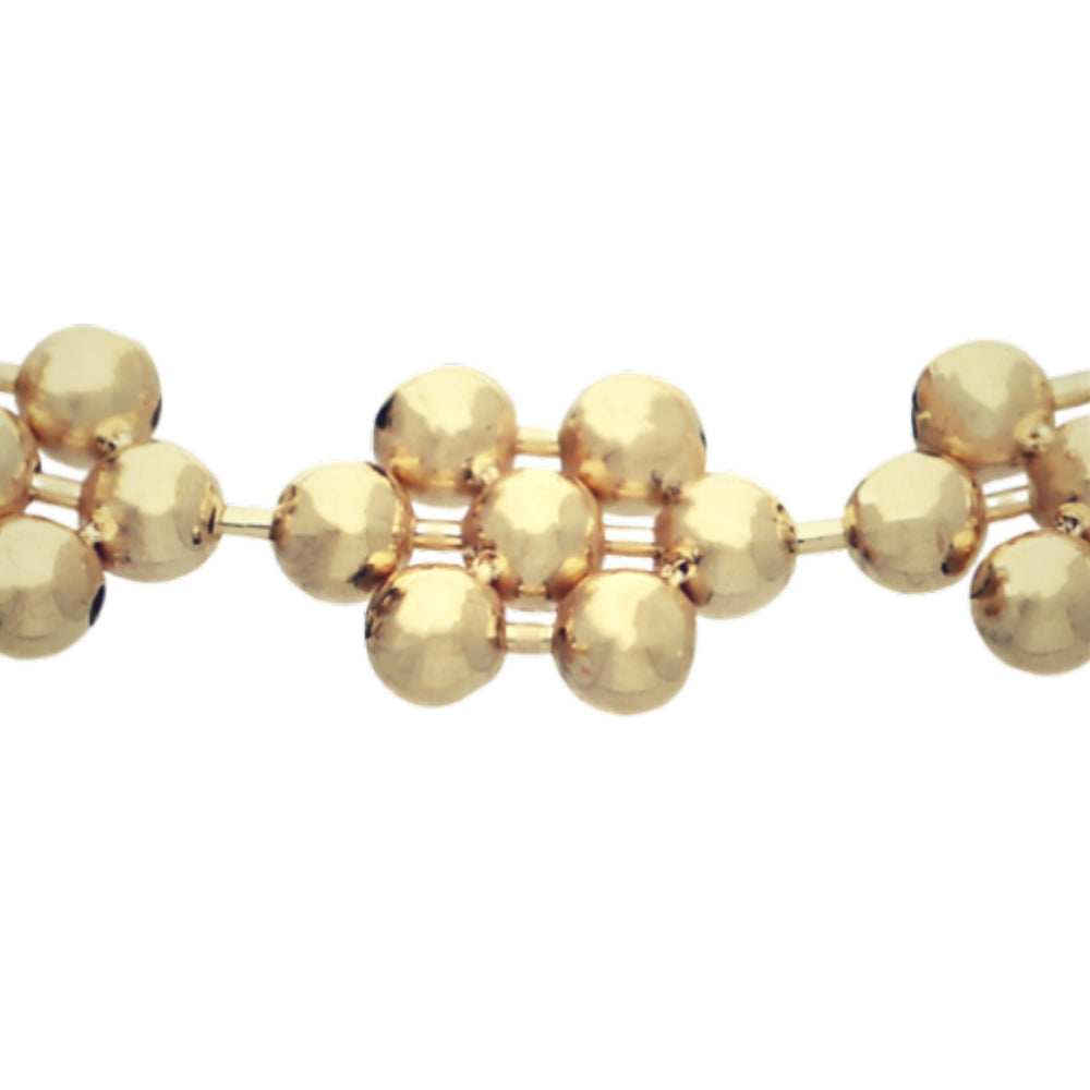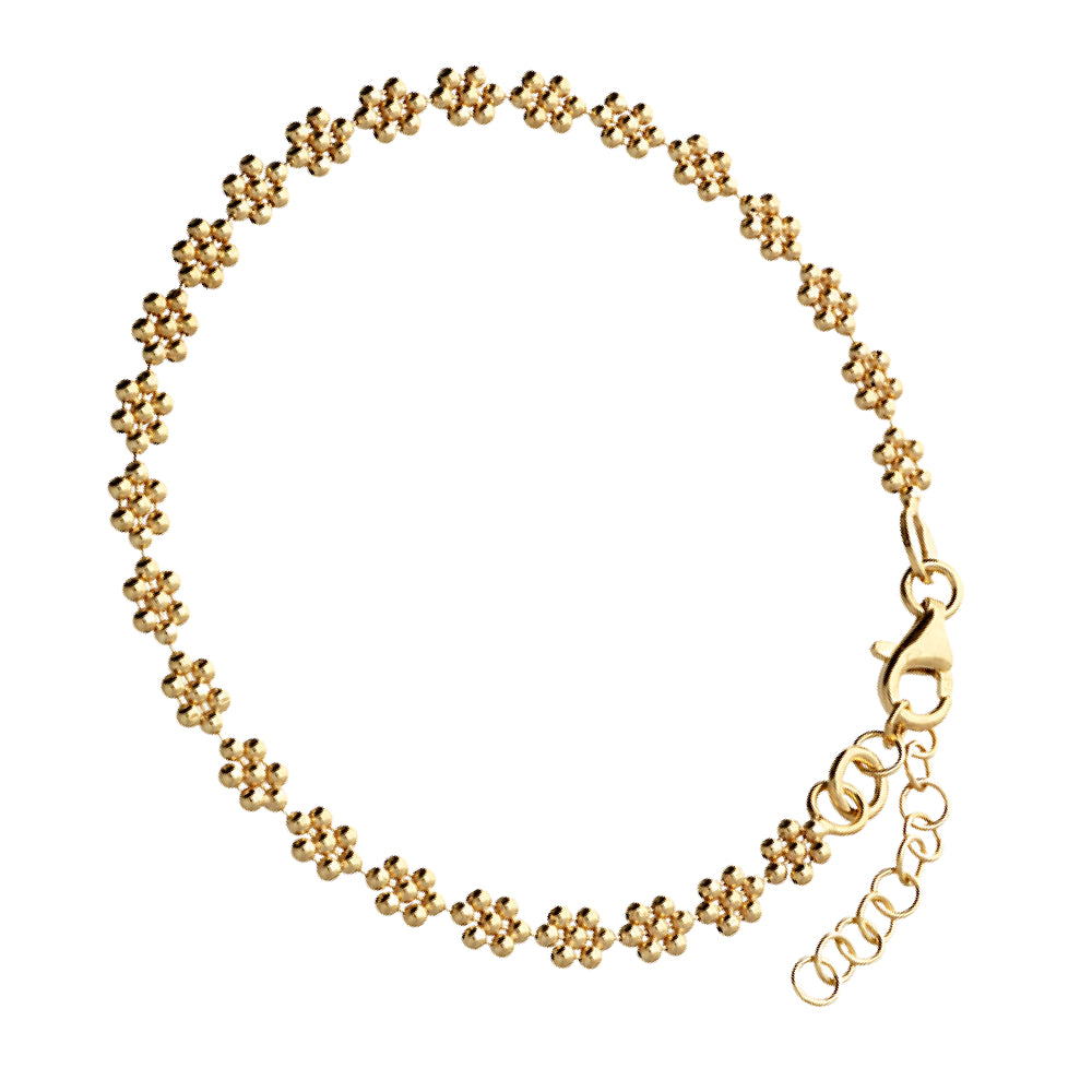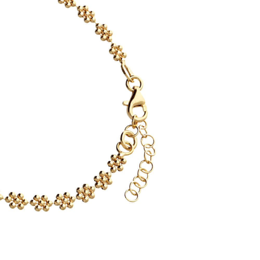 Yellow gold plated 17cm plus 3cm extender beaded flower chain in 925 sterling silver nbracelet. Navya London includes a variety of designs from everlasting classic pieces to those with a modern day twist. Our 9ct gold allows for comfortable wear, especially for those with sensitive skin. Our gold products are created by applying traditional processes to contemporary designs inspiration from around the world, ensuring high quality craftsmanship and materials without losing the edge. A perfect gift for yourself or that special person in your life. Your jewel is presented in a beautiful gift box.