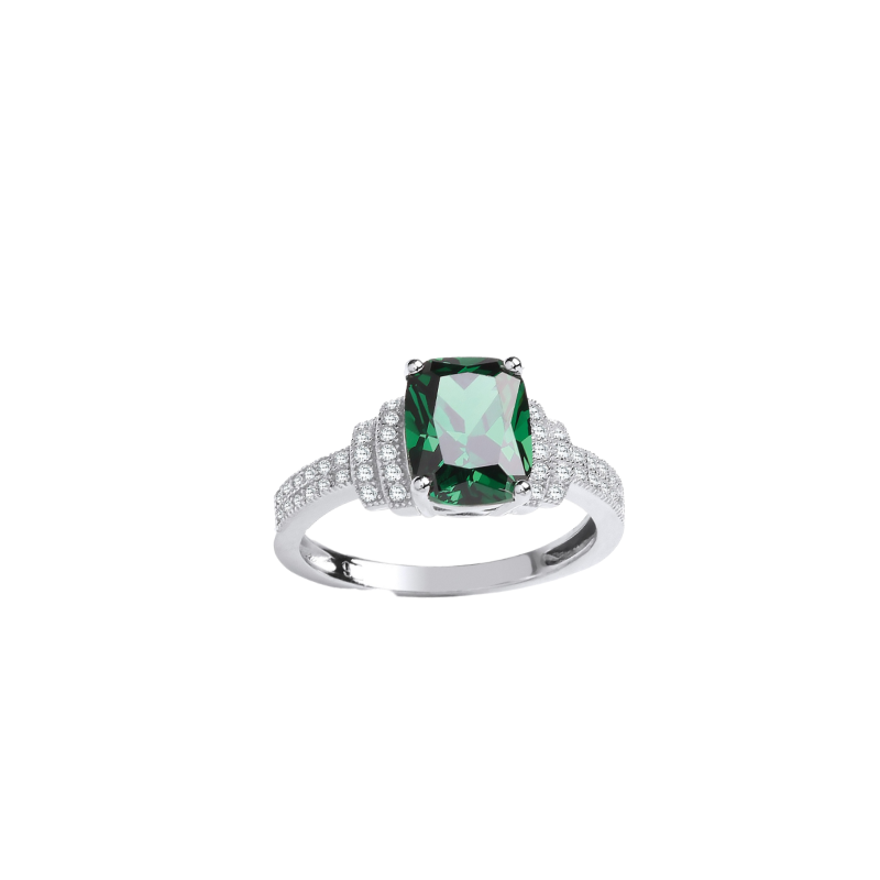 Emerald cut green cubic zirconia centre with clear cubic zirconia on shoulder in 925 sterling silver ring. Navya London includes a variety of designs from everlasting classic pieces to those with a modern day twist. Our 925 sterling silver allows for comfortable wear, especially for those with sensitive skin. Our silver products are created by applying traditional processes to contemporary designs inspiration from around the world, ensuring high quality craftsmanship and materials without losing the edge. A perfect gift for yourself or that special person in your life. Your jewel is presented in a beautiful gift box.