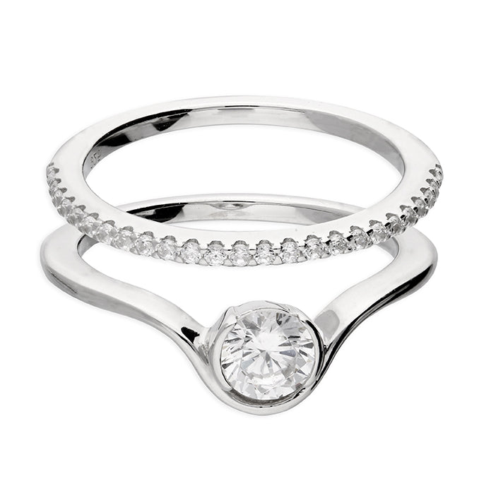 Set of two cubic zirconia half eternity and cubic zirconia solitaire with sterling silver rings. Navya London includes a variety of designs from everlasting classic pieces to those with a modern day twist. Our 925 sterling silver allows for comfortable wear, especially for those with sensitive skin. Our silver products are created by applying traditional processes to contemporary designs inspiration from around the world, ensuring high quality craftsmanship and materials without losing the edge. A perfect gift for yourself or that special person in your life. Your jewel is presented in a beautiful gift box.