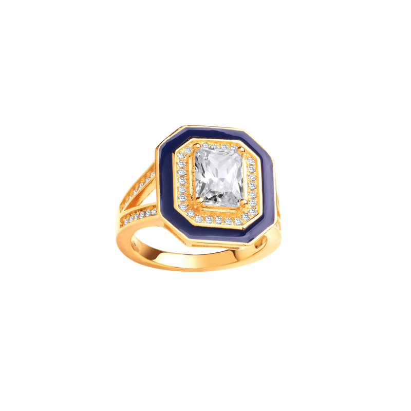 High setting split shank blue enamel and cubic zirconia in yellow gold plated 925 sterling silver ring. Navya London includes a variety of designs from everlasting classic pieces to those with a modern day twist. Our 925 sterling silver allows for comfortable wear, especially for those with sensitive skin. Our silver products are created by applying traditional processes to contemporary designs inspiration from around the world, ensuring high quality craftsmanship and materials without losing the edge. A perfect gift for yourself or that special person in your life. Your jewel is presented in a beautiful gift box.