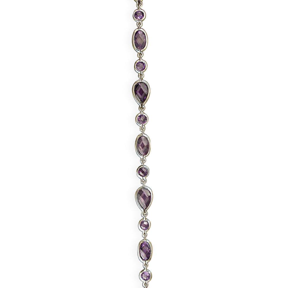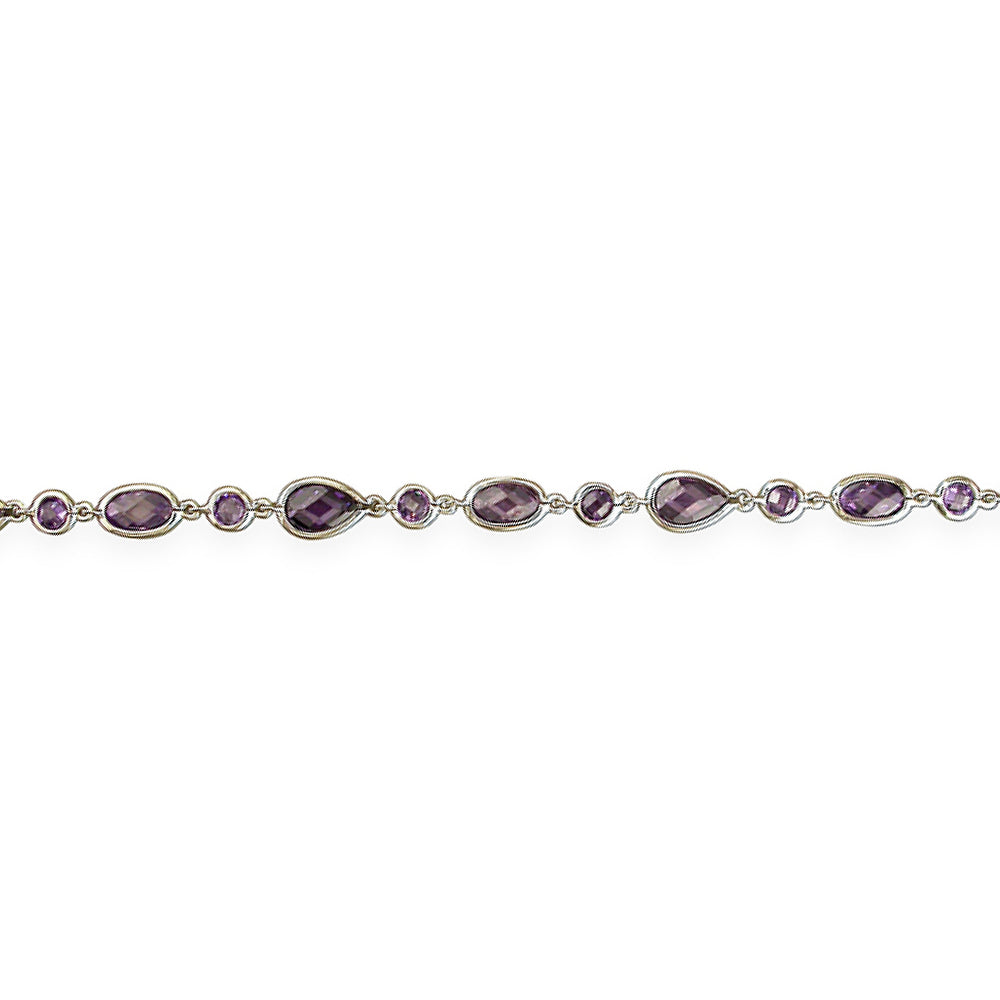 Round oval and pear shaped amethyst coloured cubic zirconias in 925 sterling silver bracelet. Navya London includes a variety of designs from everlasting classic pieces to those with a modern day twist. Our 925 sterling silver allows for comfortable wear, especially for those with sensitive skin. Our silver products are created by applying traditional processes to contemporary designs inspiration from around the world, ensuring high quality craftsmanship and materials without losing the edge. A perfect gift for yourself or that special person in your life. Your jewel is presented in a beautiful gift box.