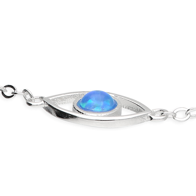 Sterling silver bracelet featuring three bezel set synthetic blue opal evil eye motifs in marquise frames. The vibrant blue opal is a synthetic stone designed to reflect the beauty of natural opal in 925 sterling silver.