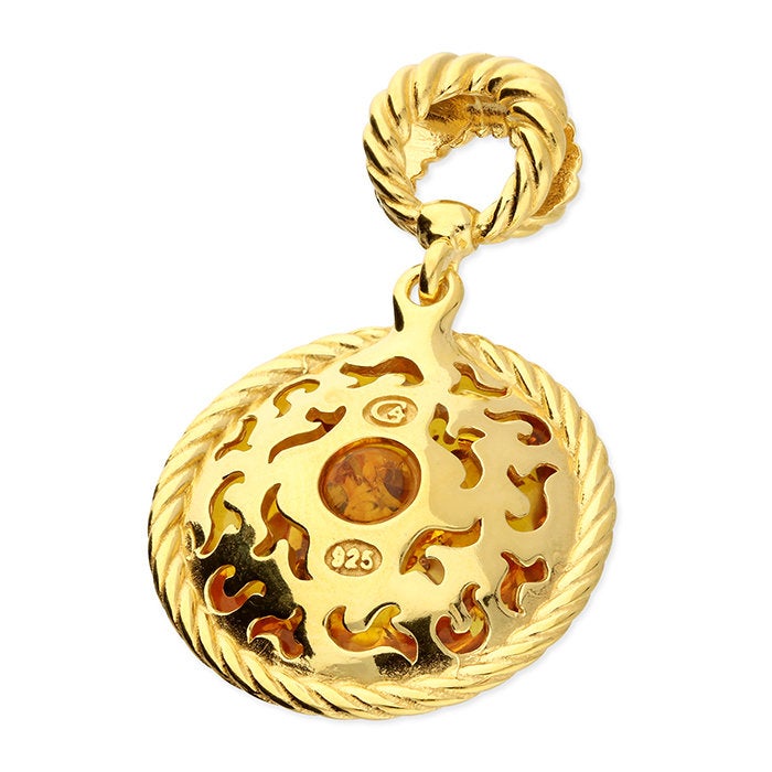 Cognac amber set in a yellow gold plated rope edged setting with rope pattern bale sterling silver pendant. Navya London includes a variety of designs from everlasting classic pieces to those with a modern day twist. Our 925 sterling silver allows for comfortable wear, especially for those with sensitive skin. Our silver products are created by applying traditional processes to contemporary designs inspiration from around the world, ensuring high quality craftsmanship and materials without losing the edge. A perfect gift for yourself or that special person in your life. Your jewel is presented in a beautiful gift box. Measurements are 35mm from top of bale to bottom of pendant, pendant is 21mm diameter.