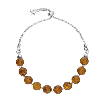 Silver bracelet with round amber beads evenly spaced along gold tone slider chain. Finished with a smooth adjustable clasp for a tailored fit in 925 sterling silver.